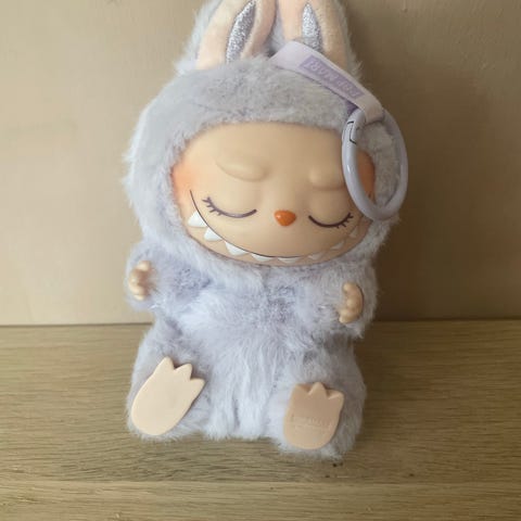 Have A Seat Labubu figur I lavendelfarge. Figuren har sovende ansikt, store ører og ring øverst for oppheng. Leveres i original eske merket "Have A Seat Labubu". Egnet som samlefigur eller dekorasjon.