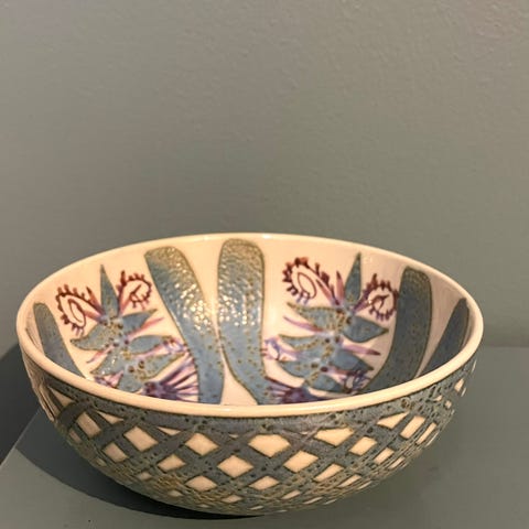 Skål på stett nr 1023 (har 3 stk), høyde 6 cm, diameter 17,5 cm. Kr 2500. Uten merker el skader.
