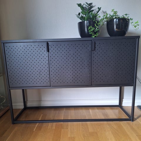 IKEA PS metal media møbel, tidlig utgave kjøpt i 2005, den er hel og fin men med bruksmerker- den er skrubbet og vasket og klar for ny eier. Jeg har fjerne klistremerker med varmluft men det synes noen plasser at det har vært klistremerker på.