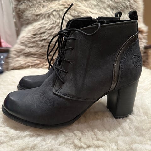 Støveletter / Ankelstøveletter / boots /skoletter med spenner foran og glidelås i siden. kant med Teddyfor øverst. Høye hæler , Ubetydelig brukt .