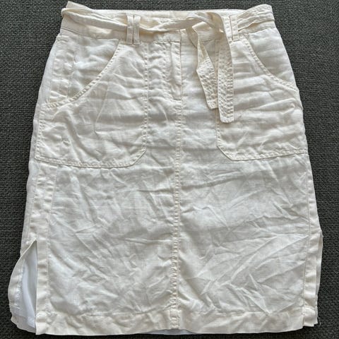 Pent skjørt med mange fine detaljer. Knapper, lommer, glidelås i siden og knytebelte. Lin- og bomullsblanding. Str M. Brukt en gang