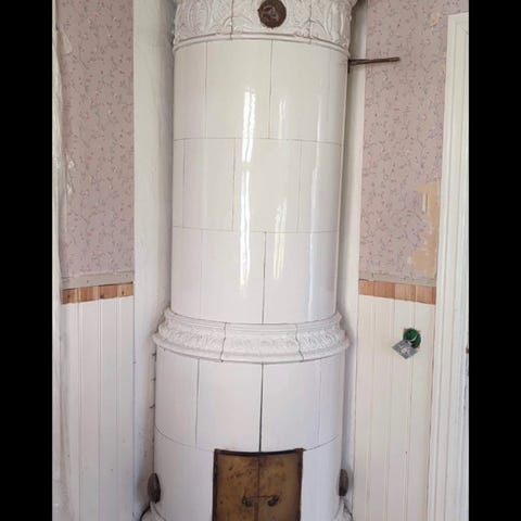 En fin antikk kakkelovn fra ca 1910, med midtbånd og fine malte detaljer på krone og bånd.