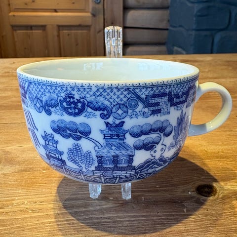 Selger 4 gamle kopper i klassisk engelsk Blue Willow-stil. Trolig tidlig produksjon uten stempel. Flott glans og ingen skader.