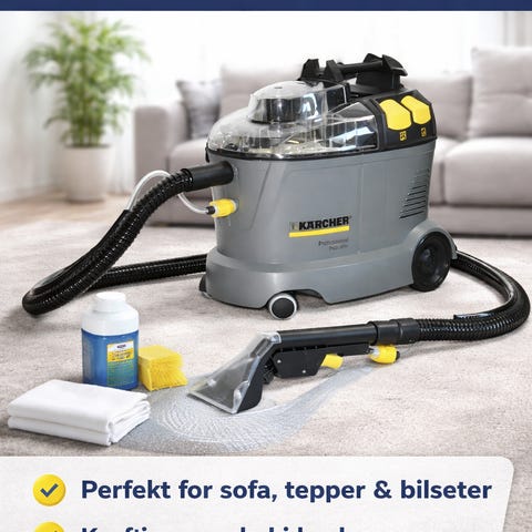 Lei toppmodellen Puzzi 10/1 fra Kärcher – en profesjonell møbel- og tepperenser som gir resultater langt over det du får med små, enkle utleiemaskiner fra byggevarehus.