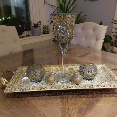 Fargen er lys gull, ikke ren sølvfarge som bildene gir inntrykk av. Stått veldig kort til pynt før den ble ryddet bort.