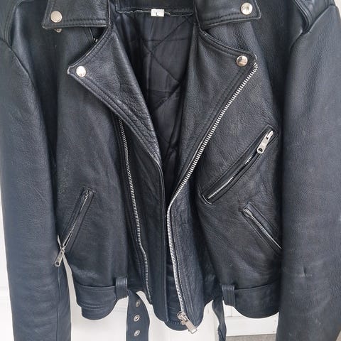 Svart fôret lærjakke merket "Echtes Leder, Futter 100% viscose. S". Elastiske felter nederst på begge sider. Ermene avtagbare med glidelås rundt skuldrene - glidelåsene er ellers usynlige med overlappende lærbånd. Flere forskjellige lommer med glidelås både på ut- og innsiden. Størrelser 68 cm nakke-nederst, 48 cm over skuldrene, 48 cm ermene fra armhulen.