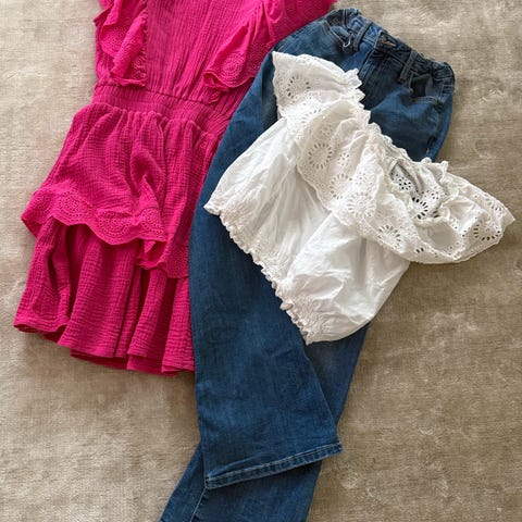 Dongeriskjørt og dongeribukse er i str 104. Begge disse er såvidt brukt og er i svært god stand. 😊