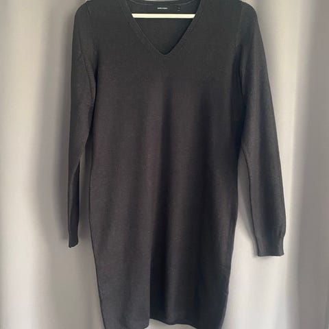 Meget pent brukt strikkekjole fra Vero Moda. Figurnær A-fasong og V-hals. Overlappet foran. Stoffet er lagt så strikken går vertikalt på toppdelen og horisontalt på skjørtet.