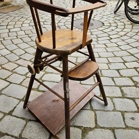 Barnestol med ødelagt sete ser etter en nevenyttig person som kan fikse den.