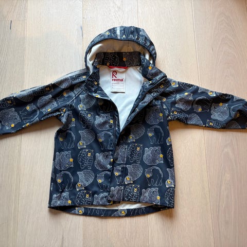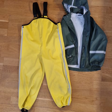 Sommer-regnsett fra Reima. Stroppene er hele og fine, noen små flekker på jakken. Men settet er ellers i hel og fin stand med mye bruk igjen. Str. 110