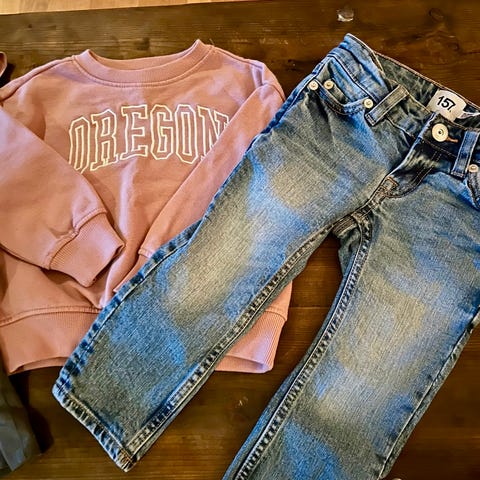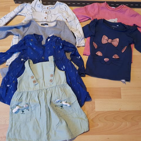 Fin klespakke til jente. Det meste er pent brukt. 9 plagg. Vindjakke, solhatt, to t-skjorter, bukse, fleecebukse, kjole og to stk korte leggings. To par sokker følger med. Leggings har noen flekker som kan gå bort ved grundig vask.