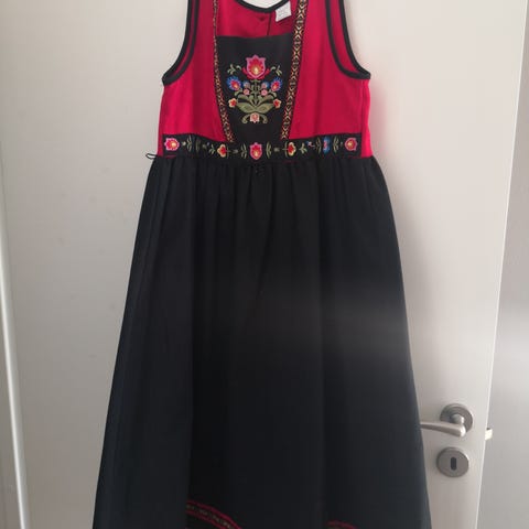 Bunad fra Lindex str 134 med svart skjørt og rød overdel med blomsterdetaljer.