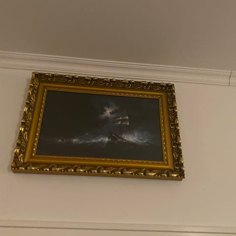 Ser ut som rammen ikke er stiv nokk til å presse selve bilde helt rett. Ellers helt og fint med noen bruksmerker i rammen.