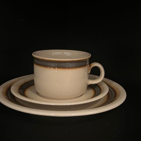 Serviset Elisabeth i keramikk. Designet av Marianne Westman for Rørstand i produkjson 1961- 1981, Sverige. Håndmalt blå og grønn stripe på lysegrå bunn.