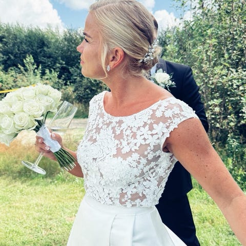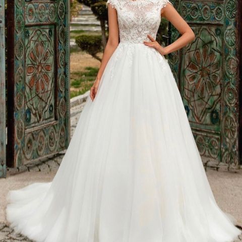 Selger en brudekjole av Lina Becker til en god pris da den trenger en tur på renseri. A-linjeform. Underskjørt følger ikke med.