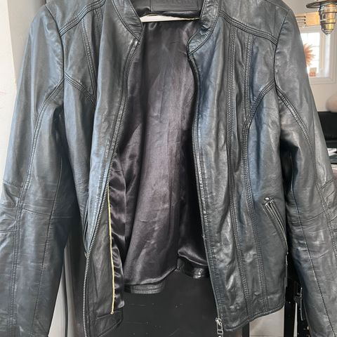 Jakken er nesten ikke brukt. Fremstår som ny. Strl. 34. 100% sheep leather utvendig og 100% polyester inni. Kan sende flere bilder hvis ønskelig.