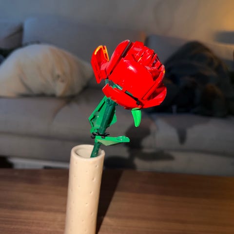 Selger min ferdigbygde bukett av villblomster fra Lego.