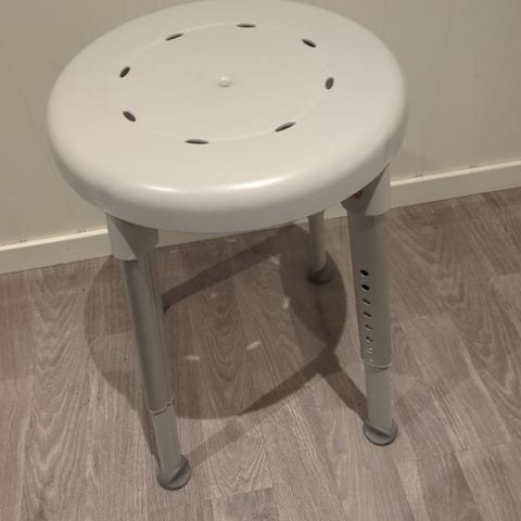 Justerbar høyde og stabil da ben peker utover bredden på setet. Alu ben og antiskli gummeføtter. Plast sete for lett rengjøring/hygiene.