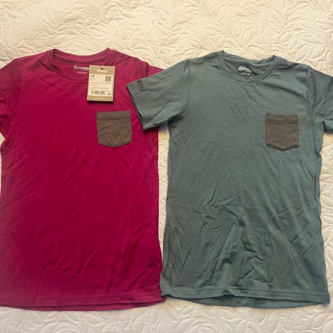Pent og lite brukt t-shirt fra Bergans. Str 152 cm og grønn med grå lomme på brystet. Denne er fin å gå med på fjellturer. 70% merinoull og 30% viskose.