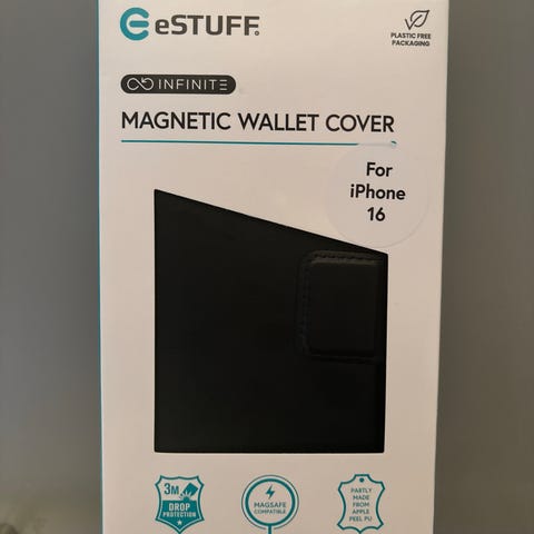 Sort pu skinn med magnet lås. 3 bankkort lommer samt lang lomme bak disse.