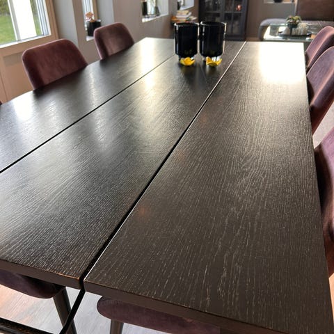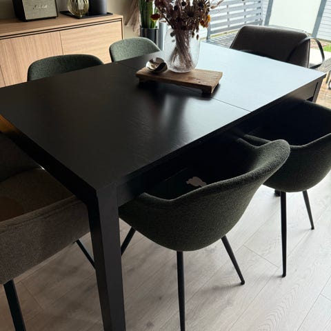 Selger 4 stk stoler i grå farge. Kjøpt på Skeidar. Passet godt på men han noen bruksmerker som er avbildet. Merker på rygglenet er kommet fra spisebordet og et lite klistremerke som ikke går av, men har ingenting å si for bruken og synes nesten ikke. Ellers har de blitt rengjort med fuktig klut med jevne mellomrom. Bordet er veldig slitesterk og selges med tungt hjerte men ble for lite for oss. Selges samlet. Pris kan diskuteres ved rask avgjørelse.