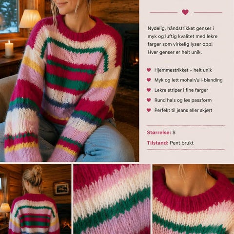 Strikket med 3 tråder Viking mohairgarn. Myk og god. Kun brukt et par ganger, da den ble litt for liten til meg.
