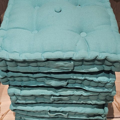 4 stk mørk blå tykke gode sitteputer, enten til inne eller utendørsbruk.