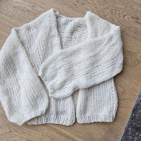 Hvit hjemmestrikket genser med mønster. Har krympet litt i vask, og derfor tovet litt og blitt litt mindre enn jeg får på meg.