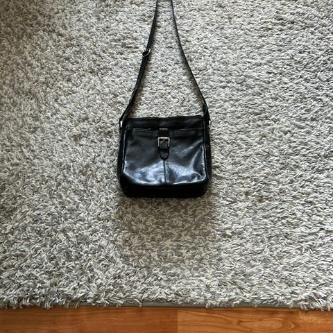 Flott vintage Lottusse veske i svart skinn / lær. Kan bæres både crossover og over skulder. Unisex. 25 cm høy og 22 cm lang. Ett hovedrom og glidelåslomme bak + 2 nettinglommer i front og lokk og mobil / småtinglomme inni. Kan hentes i Oslo eller sendes. Kjøper betaler porto.