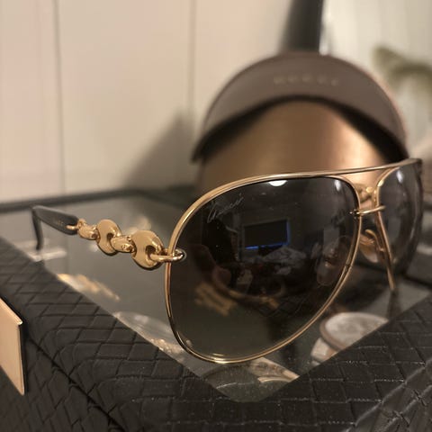 Gucci solbriller, selges med etiu. Pent brukt men noen små riper må regnes med. Veldig fine på. Ordentlig gode glass. Selvfølgelig ekte vare.