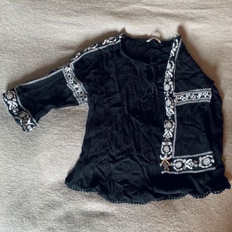 Marks & Spencer bluse for dame i størrelse S. Blusen er svart og har lett, gjennomsiktig stoff med volangdetaljer foran. Lange ermer med lett rynket avslutning. Passer til både hverdags- og penere antrekk, for eksempel over topp eller singlet.