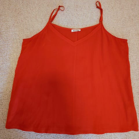 Selger en helt ny og ubrukt singlet fra H&M i en klar og frisk rødfarge. Toppen har tynne stropper, løs passform og lett stoff – perfekt til varme sommerdager, ferieturer eller som en enkel og behagelig overdel under blazer eller jakke.