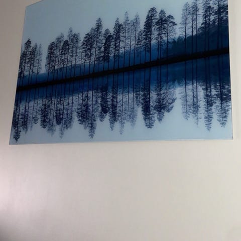 Selger et stemningsfullt og elegant veggmaleri med botanisk motiv i abstrakt stil. Fargene går i beroligende nyanser av blått, lilla og krem, som gir en rolig og moderne atmosfære til rommet. Motivet viser delikate greiner med duggdråper og bokeh-effekt i bakgrunnen – perfekt for deg som ønsker et kunstverk med dybde og ro.