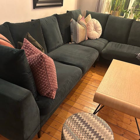 Veldig komfortabel og sterk kort fløyels marineblå hjørnesofa.