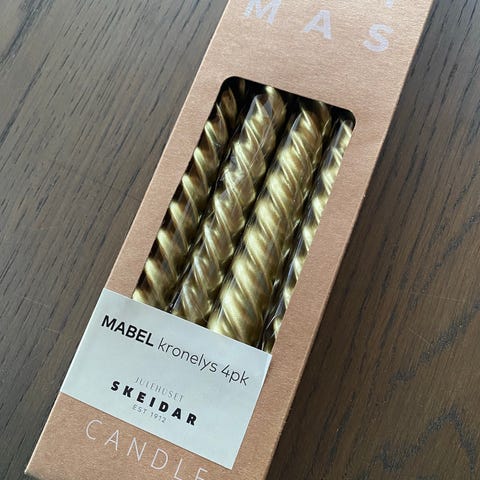 Pakke fra Candel Moments med to twisted / tvinnede lys / vridde lys / snurrelys / spirallys i lys 17. mai farger. Model: "Crown top candle"