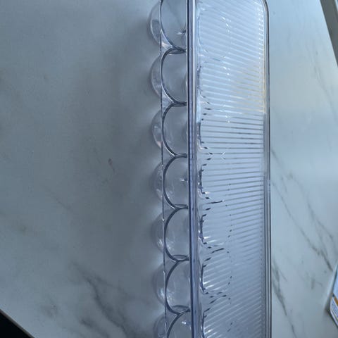 Grå holdere til egg 2 × 6 stk, som festes på bakre hyllekant. Eggene står litt skrått, lette å ta ut, og du risikerer ikke at de triller på gulvet. De kan også plasseres direkte ned i selve hyllen. Holderene passer til andre kjøleskap også, se mål: