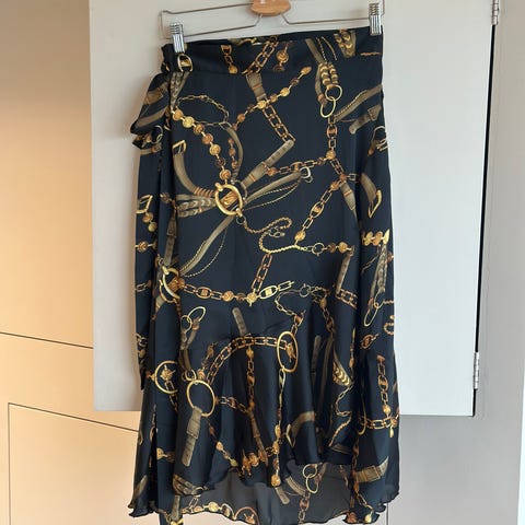 Omslagsskjørt fra det eksklusive danske merket Karmamia. Ny pris er rundt 2000kr. Lett og behagelig stoff. I og med at det er omslagsskjørt passer det en xs-m.