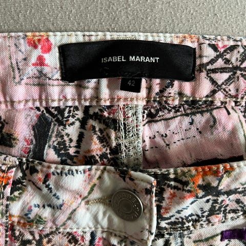 Litt avfarging rundt Isabel Marant lappen bak på buksen, som er skjedd etter vask.