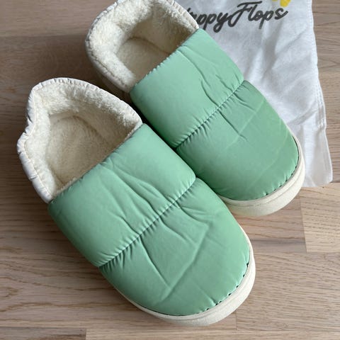 Selger et par HappyFlops Cozy tøfler i str. 36-37, helt ubrukte og i original stand! De er supermyke, varme og utrolig komfortable – perfekte for kjølige morgener eller avslapping hjemme.