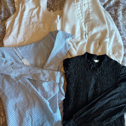 Diverse klær med lappen på.