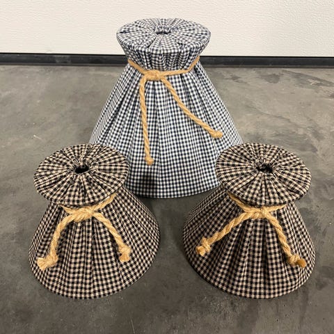 2 hvite lampeskjermer med diameter 12 cm øverst og 17 cm nederst. Høyde 13 cm.