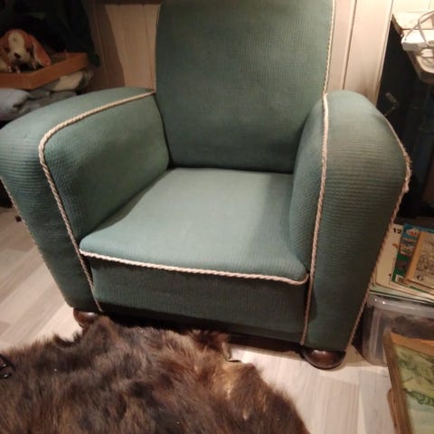En særpreget stol med broderi på stramei, ingen slitasje (stolen er fra min gamle, barnløse tante , og ingen andre enn dukken hennes fikk sitte der)
