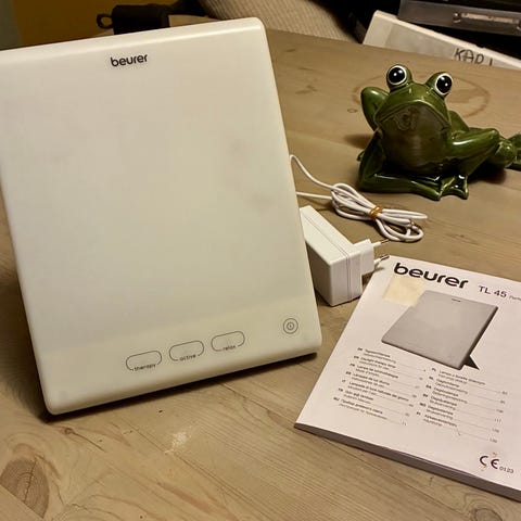 Nesten ubrukt Beurer Brighlight lysterapilampe TL30. Den er en kompakt lysterapilampe på størrelse med et mindre nettbrett, men på tross av sin kompakte størrelse gjør den en stor forskjell i løpet av de mørke vintermånedene. Den avgir et kraftig lys som har lignende effekt som direkte sollys.