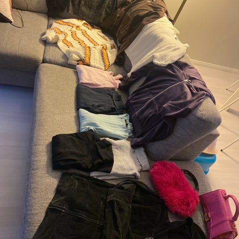 Klespakke str xs/s. Inneholder blandt annet en penbukse, en kjole som er ubrukt, en bluse som er ubrukt, en jakke som er lite brukt.