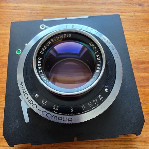 Montert i Prontor no 1 lukker, Sinar brett. Blender scala(9 til 45) mangler, forrige eier har riset noe merker som skal vise blender trinn for denne objektivet men ingen garanti.