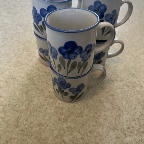 To store kaffe/ te krus , made in China, kan se ut som håndmalt dekor da de ikke er helt like.
