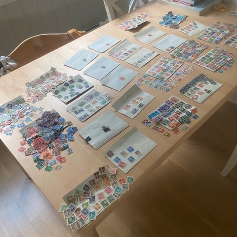 4-500 frimerker fra ulike land, hovedsakelig i Europa, blant annet Polen, Romania, Ungarn, DDR, Sovjetunionen og Spania.