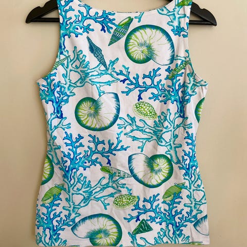 Emily van den Bergh, topp uten ermer, bluse, sitroner, str 42, prøvd på, kr 500