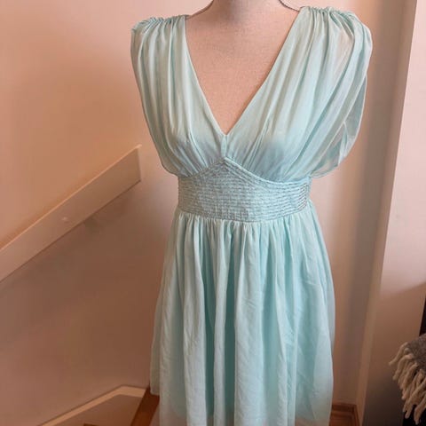 Godt brukt sommerkjole med strikk i livet og overlappet v-utringning. Foret. Å skryte av kvaliteten ville være både løgn og selvbedrag, men det er en søt kjole til en bra pris. Generelt lite pent sydd og litt rufsete både her og der. Mangler størrelses-merking, men se på bilder for mål. God strikk, så den kan strekkes til bredden på en vanlig kleshenger. Polyester, antar jeg med ganske stor sikkerhet, men foret er muligens bomull.
