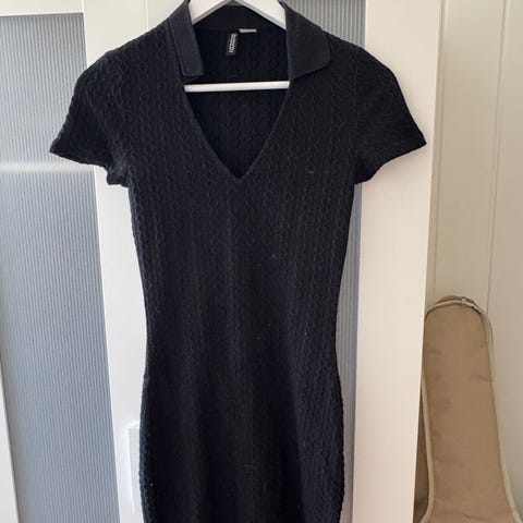GUESS festkjole for dame i størrelse XL. Kjolen er svart og har kort erm og dyp V-utringning med ribbestrikket kant. Modellen er figurnær med ribbestrikk nederst som gir en tettsittende avslutning. Diskré logodetaljer fra GUESS foran. Egner seg til fest og andre anledninger der man ønsker en enkel, men delikat kjole.